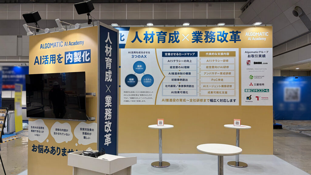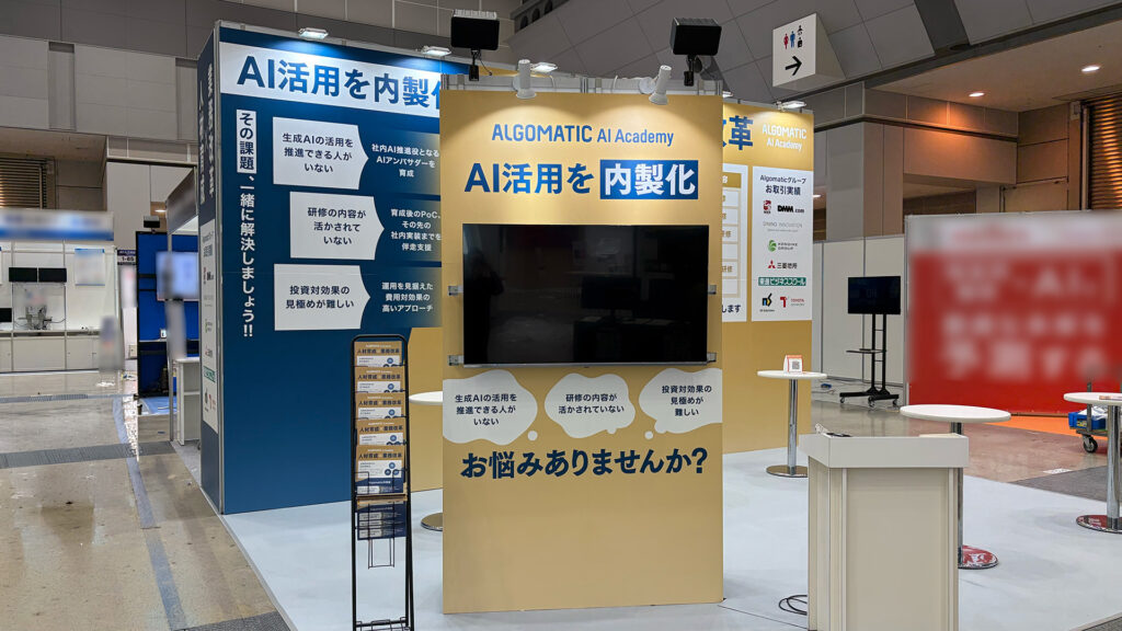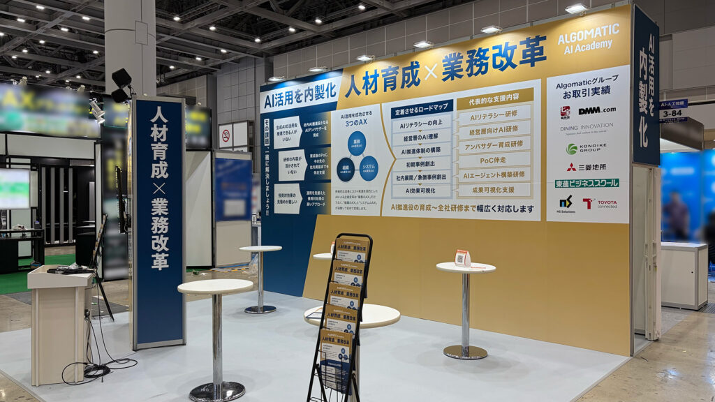 本ブースでは、壁面を効果的に活かした空間設計により、「AI活用を内製化」「人材育成×業務改革」というメッセージが来場者に伝わりやすい構成を実現。